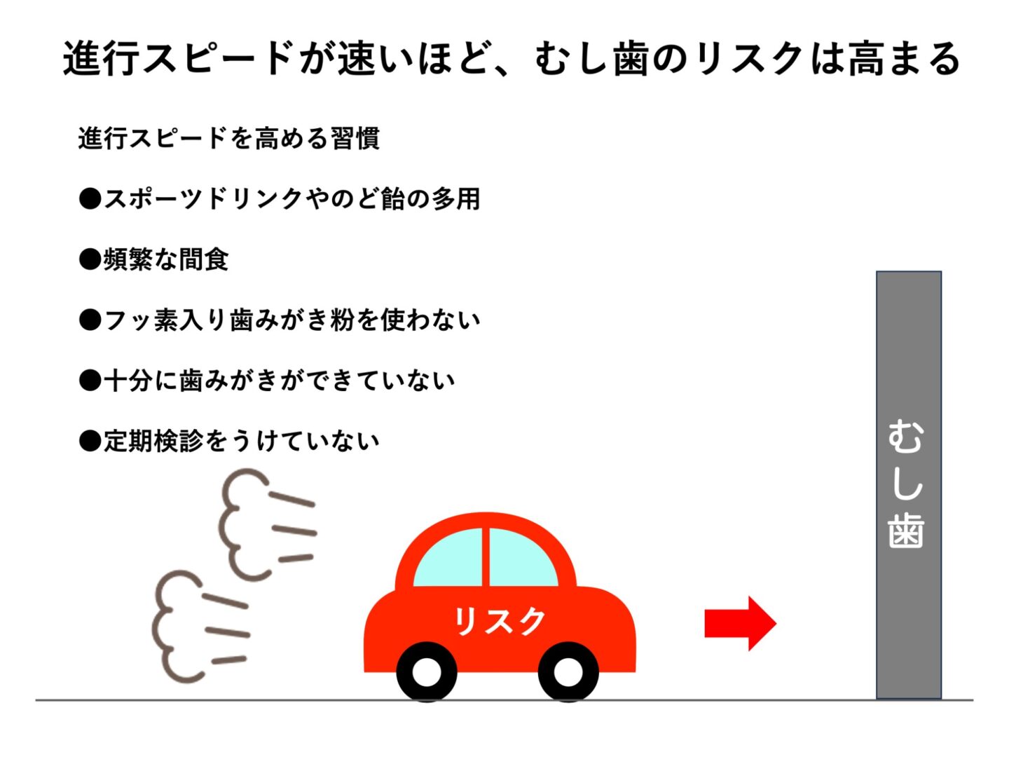 つまり、日々の習慣でむし歯のリスクがある状態を積み重ねていると、知らないうちにアクセルを踏み込んでいることになります。
